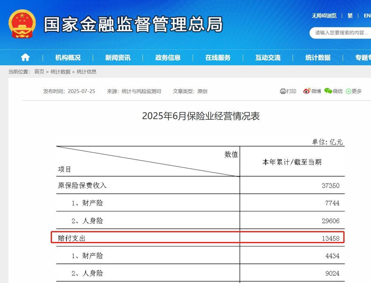 近日,国家金融监管局发布相关数据,6月保险业赔付支出高达13458亿元,其中财产险4434亿元慧仁策略,人身险9024亿元!